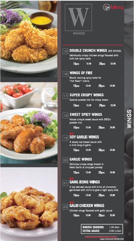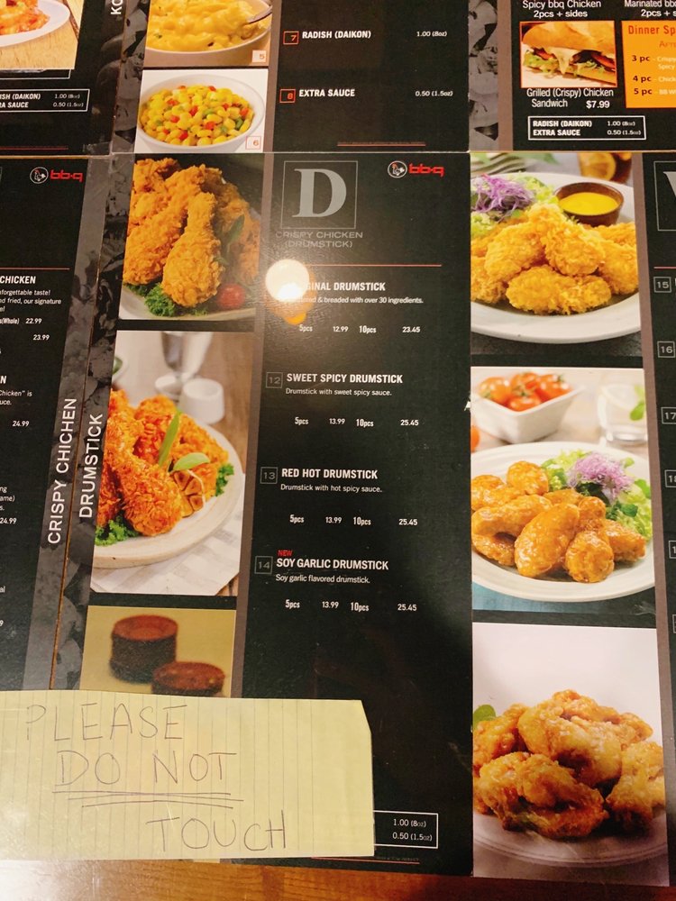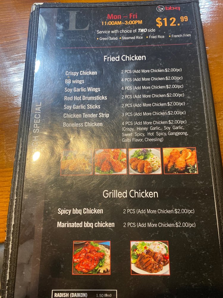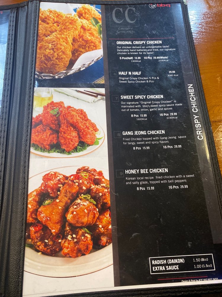 "Introducing the menu at BBQ Chicken - Irvine, located at 2750 Alton Pkwy Ste 111 Irvine, CA 92606, offers a variety of salads such as Grilled Chicken Salad, Crispy Chicken Salad, Crispy Chicken Caesar Salad, and Garden Salad. Their Crispy Chicken menu includes options like Original Crispy Chicken, Sweet Spicy Chicken, and Gang Jeong Chicken. Drumsticks come in flavors like Original, Sweet Spicy, Red Hot, and Soy Garlic. Customers have raved about the perfectly cooked, crispy, and juicy chicken dishes. The Double Crunch Wings are a favorite, known for their perfect crunch, flavor, and level of spiciness. Prices may be higher, but the quality and taste make it worth it. The restaurant offers delivery, catering, and a weekday lunch combo, making it a great option for delicious Korean fried chicken."